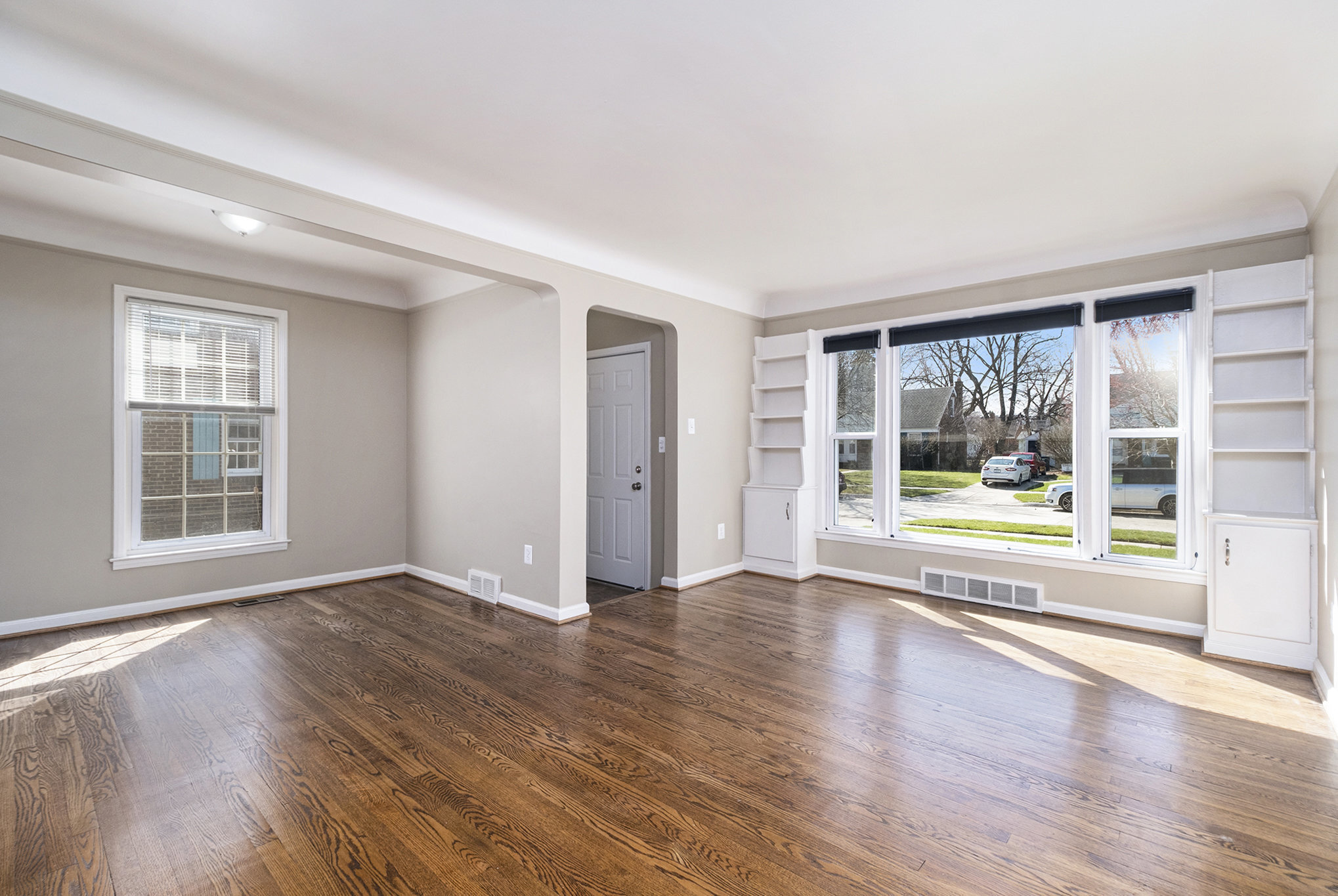 The appeal begins at the curb with a fresh exterior, newer cement, and beautiful landscaping. The covered front porch welcomes you into the heart of this charmer, the spacious living room with gorgeous refinished hardwood floors, coved ceilings, and a large picture window framed by charming built-ins for the era. The hardwood floors extend throughout the main level into the bedrooms!