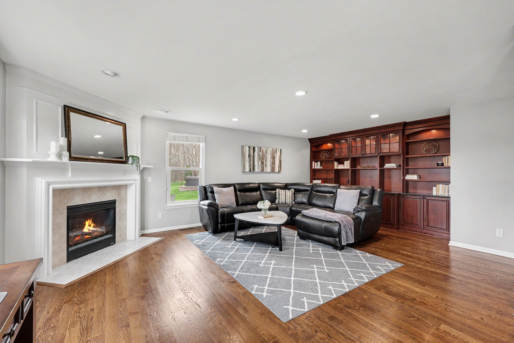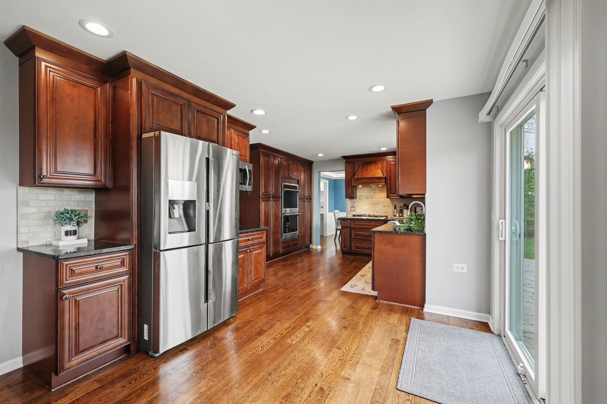 The completely updated kitchen and family rooms function as the center of daily life. A gas cooktop with a custom wood range hood, built-in double oven, and well-planned cabinetry anchor the kitchen, while the spacious granite counters make hosting dinners easy. The adjoining family room features a four-season view of the treeline and offers custom built-ins to keep everything properly put away, yet within reach. The door wall leads to the patio with a huge backyard, creating a natural extension of the living space where you’ll spend summer days lounging.