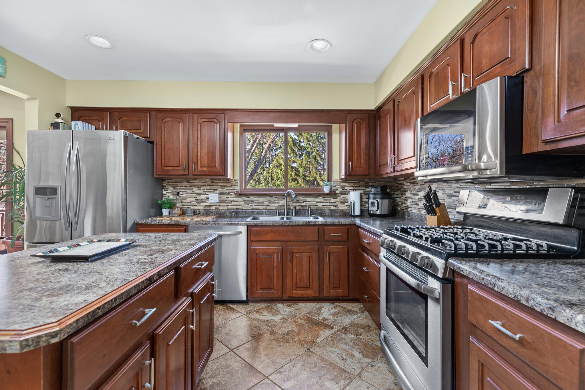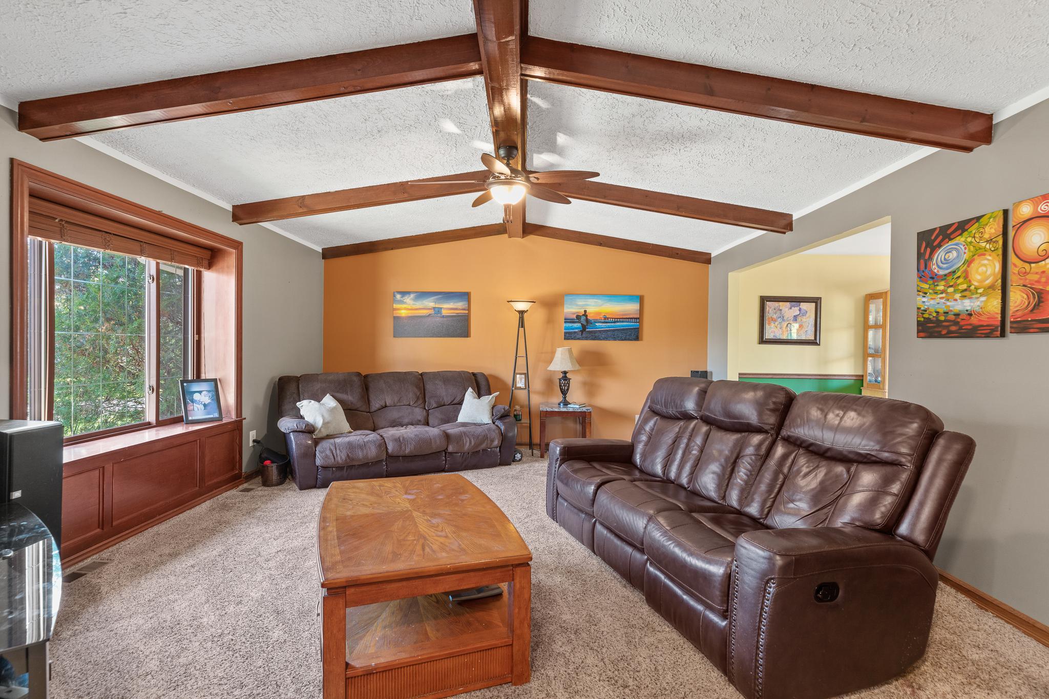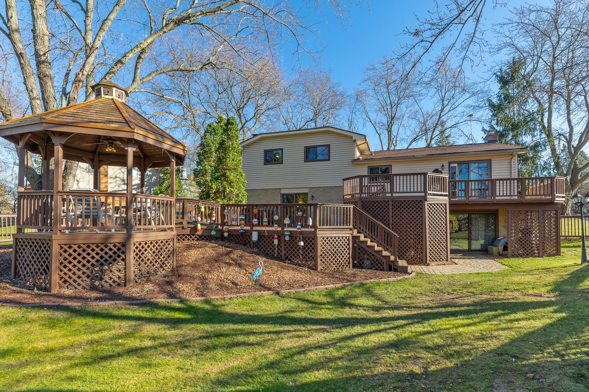 This solid home is no cookie-cutter and has one of the most spacious floor plans in the neighborhood. The entry offers large living and dining rooms with private treed views of both the front and back yards. The dining room is open to the beautifully updated kitchen with bar seating, stainless appliances, good counter and cabinet space, and a doorwall to a fabulous outdoor entertainment area! You’ll love the expansive outdoor living area with covered pergola and beautiful, tranquil view. The generous family room has beamed ceilings, a cozy fireplace, is wired for an overhead projector, and offers a great wet bar serving area so you can spread out during gatherings.